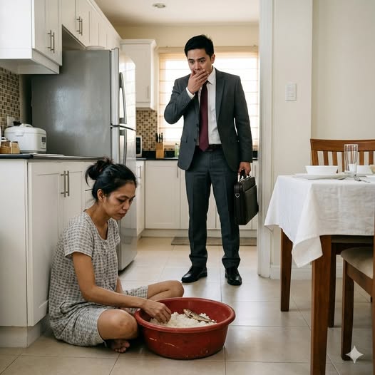 Doon, nakaupo sa malamig na sahig ang asawa kong si Clara. Payat na payat siya, nangingitim ang ilalim ng mga mata, magulo ang buhok, at nakasuot ng maduming daster. Nanginginig ang kanyang mga kamay habang sumusubo mula sa isang lumang plastic na mangkok.